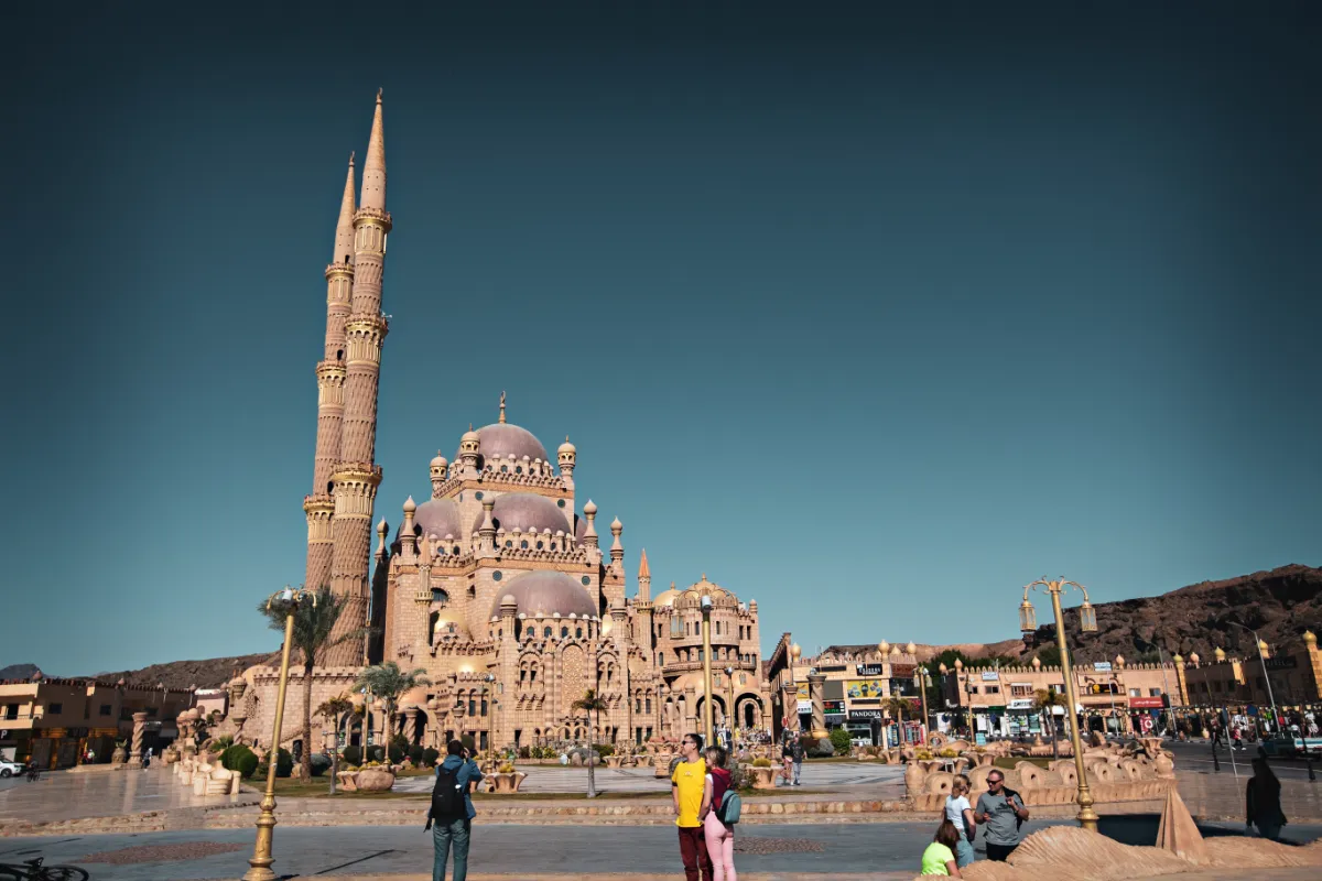 Al-Sahaba Mosque is a beautiful landmark in Sharm el-Sheikh and one of the most photographed places in Egypt. The mosque stands in the Old Market area with tall minarets, detailed carvings, and soft lighting at night. Many travellers visit here after exploring nearby shops and cafes.